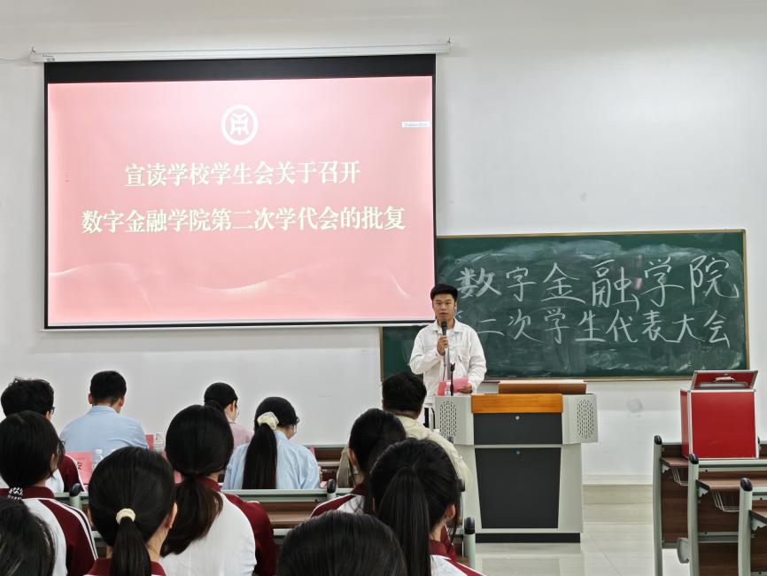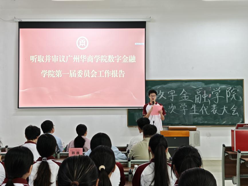 2025年11月11日下午,广州华商学院数字金融学院第二次学生代表大会在肇庆校区6号楼304教室顺利召开。本次大会以“总结过往启新程,凝心聚力向未来”为主题,全面回顾了过去一年的团学工作,选举产生了新一届学生委员会及主席团成员,并为下一阶段的工作指明了方向。 校团委何以立老师、数字金融学院团委副书记赵颖祯老师、数字金融学院学生会指导老师栗鹤杰,及各二级学院团学指导老师、校学生会代表等嘉宾出席会议。全体正式代表、监票人、计票人及工作人员参加大会。 会议议程回顾 大会在庄严的国歌声中拉开帷幕。 数字金融学院团委副书记赵颖祯老师致开幕词。她向与会代表和嘉宾表示欢迎,并强调了学生代表大会在凝聚青年力量、推动学生会改革发展中的重要作用。 校团委何以立老师宣读批复文件,代表校学生会同意召开本次学代会,并对会议筹备、组织及选举工作提出明确要求。 会上,高朋杰同学代表第一届学生委员会作工作报告,系统总结了过去一年在思想引领、组织建设、校园文化、权益服务等方面的工作成果,分析了存在的问题,并提出了未来的工作方向。 在第二次全体会议上,与会代表表决通过了总监票人、监票人、计票人名单,并投票选举产生了新一届学生委员会及主席团成员。 选举结果公布 经投票选举,大会顺利产生了数字金融学院第二届学生委员会委员及第二届学生会主席团成员。 圆满闭幕 赵颖祯老师致闭幕词。她表示,本次大会圆满完成各项议程,总结了过去经验,规划了未来发展,并对新一届学生委员会提出殷切期望,希望他们务实担当、服务同学,推动学院团学工作再上新台阶。 大会在热烈的掌声中顺利闭幕。