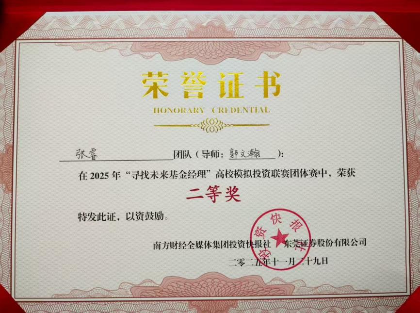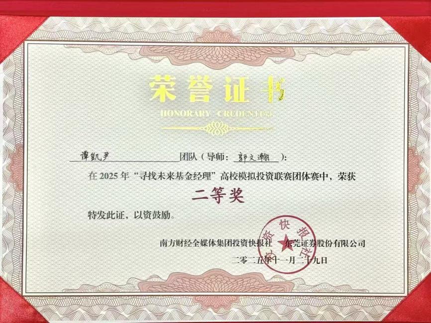 近日,2025年“寻找未来基金经理”高校模拟投资联赛总决赛圆满落幕。广州华商学院数字金融学院学子在此项大湾区高校金融实践教育的标杆赛事中表现卓越,一举夺得个人赛冠军、团队赛二等奖和团队赛三等奖的优异成绩,充分展现了我院在应用型金融人才培养方面的扎实功底与丰硕成果。 佳绩频传,华商学子闪耀金融赛场 本届赛事由南方财经全媒体集团、东莞证券联合主办,吸引了粤港澳大湾区近4000名高校学子参与。经过为期两个月的初赛、复赛激烈角逐,我院学子在模拟交易、投资策略报告和现场答辩等多个环节中脱颖而出。 尤为瞩目的是,来自我院24级金融科技优才班的刘洪旭同学,凭借其敏锐的市场洞察力和稳健的投资策略,以71.79%的超高收益率在近4000名参赛者中力拔头筹,荣膺个人赛冠军,展现了新生代金融人才的巨大潜力。 在团队赛中,由郭文瀚老师指导的“Haley”团队(成员:黄衍衔、张睿、谭凱尹、李振生) 凭借严谨的逻辑思辨、默契的团队协作和出色的现场答辩,荣获大赛二等奖,其综合素养获得评委一致好评。 由赵颖祯、魏攀老师共同指导的“感动不是心动”团队(成员:潘宏杰、刘子玉、周颖妍、马志慧)同样表现不俗,斩获团队赛三等奖。 精心组织,构建“赛教融合”育人生态 优异成绩的背后,是学院长期以来坚持“以赛促学、以赛促教、赛教融合、校企联动”人才培养模式的生动体现。 精准宣传与高效组织:赛事启动后,学院高度重视,迅速成立由院领导牵头、专业系部和辅导员协同的竞赛工作委员会,面向经管类相关专业进行精准动员和有序组织,确保了参赛工作的顺利推进。 深化产教融合:本次竞赛不仅是学生技能的演练场,更是学院深化校企合作的重要平台。通过参与赛事及相关活动,学院进一步紧密了与南方财经全媒体集团、东莞证券等头部金融机构的联系,为共建“大湾区应用型金融人才培养联盟”、拓展学生实习就业渠道奠定了坚实基础。 展望未来,培育新时代金融英才 本次大赛的丰硕成果,是对我院金融专业教学质量和应用型人才培养成效的一次重要检验。未来,数字金融学院将继续总结赛事经验,进一步优化“竞赛-教学-实习”的联动机制,计划通过组建学生竞赛梯队、鼓励跨学科组队、深化与联盟企业的课程共建等方式,不断提升人才培养质量,致力于培养更多符合新时代要求、具备国际视野和创新精神的复合型金融科技人才,为服务大湾区金融产业发展贡献华商力量。